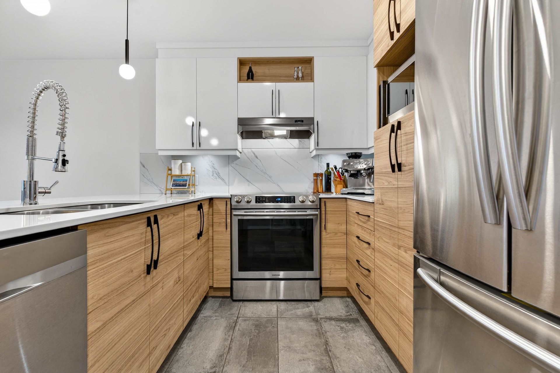 Contemporary kitchen with quartz countertops and abundant