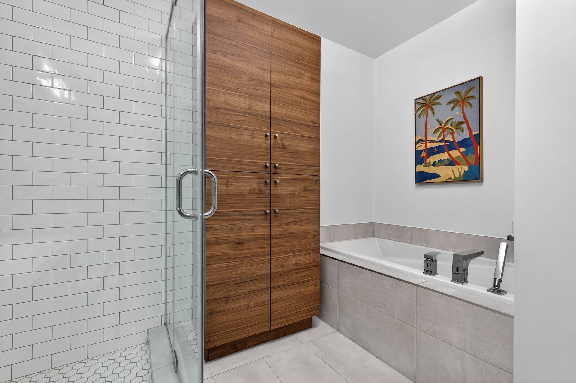 Spacious bathroom with ceramic shower and separate bathtub