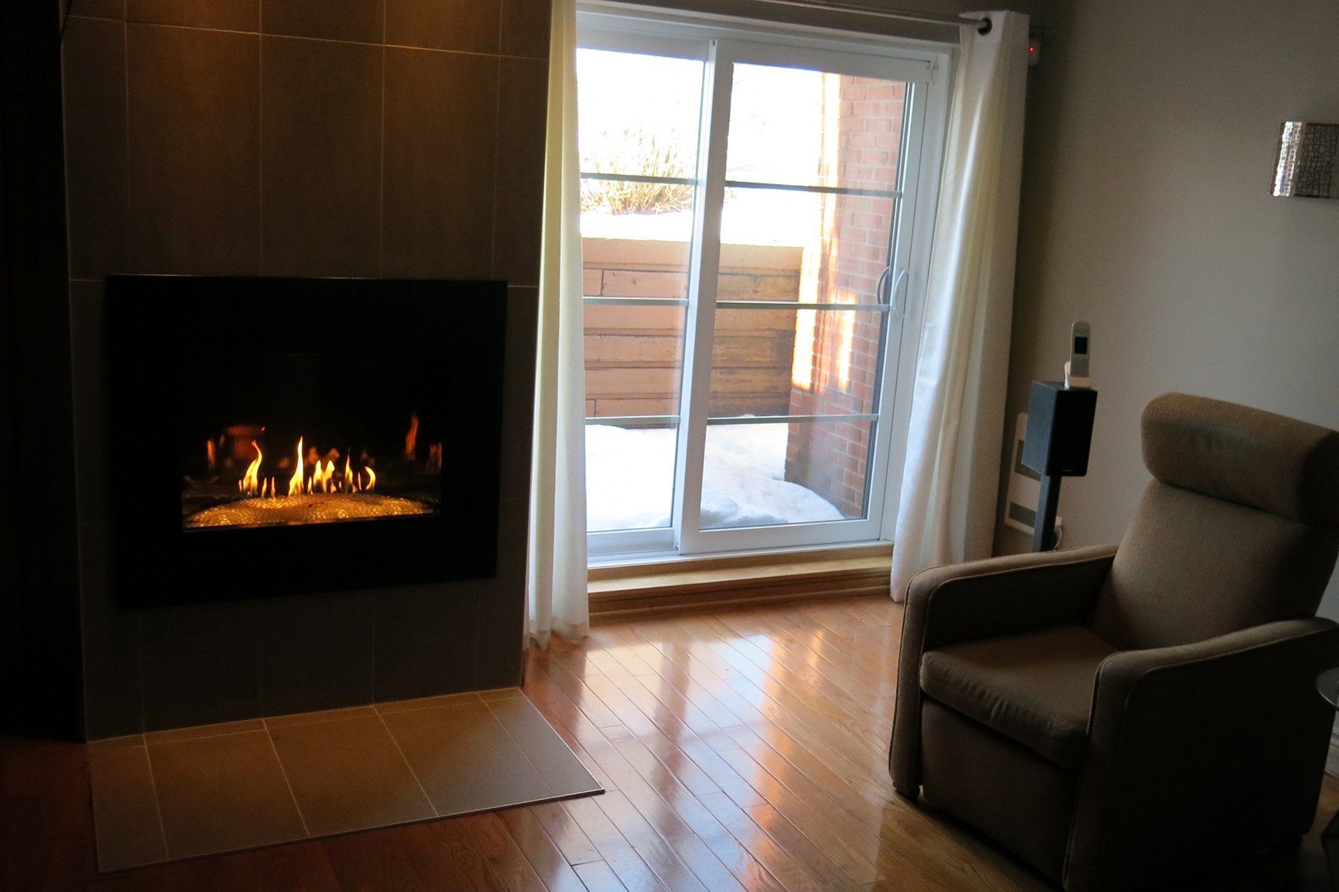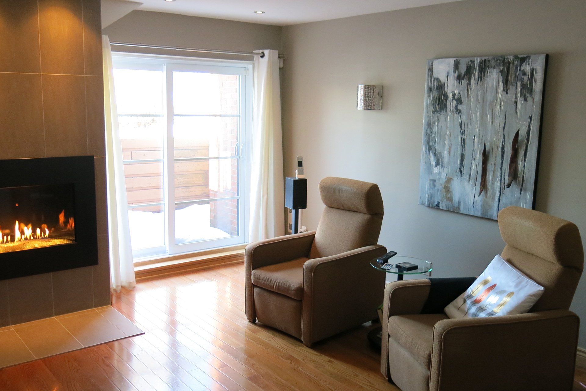 Salon et salle familiale avec foyer au gaz