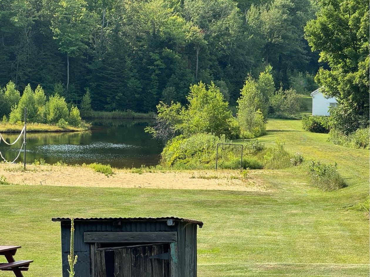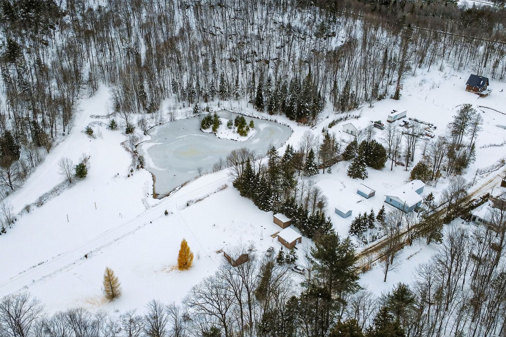 Lac privé avec plage de sable et deux mini-maisons